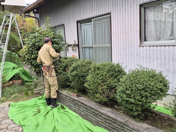 入社後8か月にして初めてお客様のお庭で剪定作業にあたります。