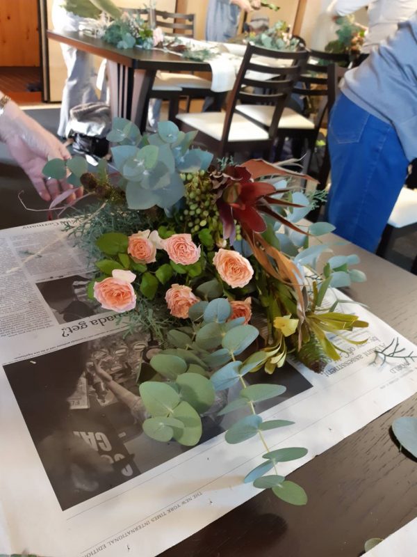 ユーカリやブルーアイスなどの枝葉、ビバーナムやネズミモチの実付き枝などを弓削さんに用意していただきました。