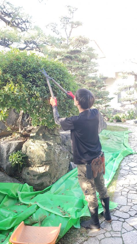 刈込みは大きな刈込バサミ(バカボンパパのはさみ)をつかって植木の輪郭を整える
