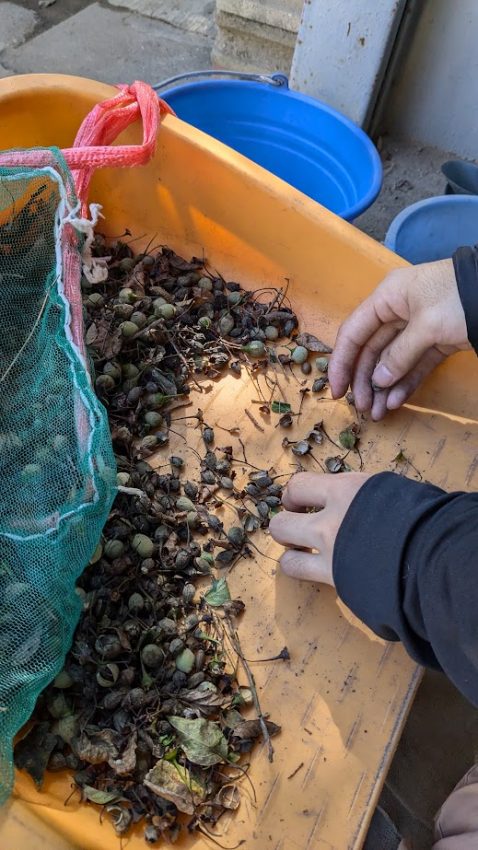 上記の写真はエゴノキの果実を割り、中から種を取り出しているところです。